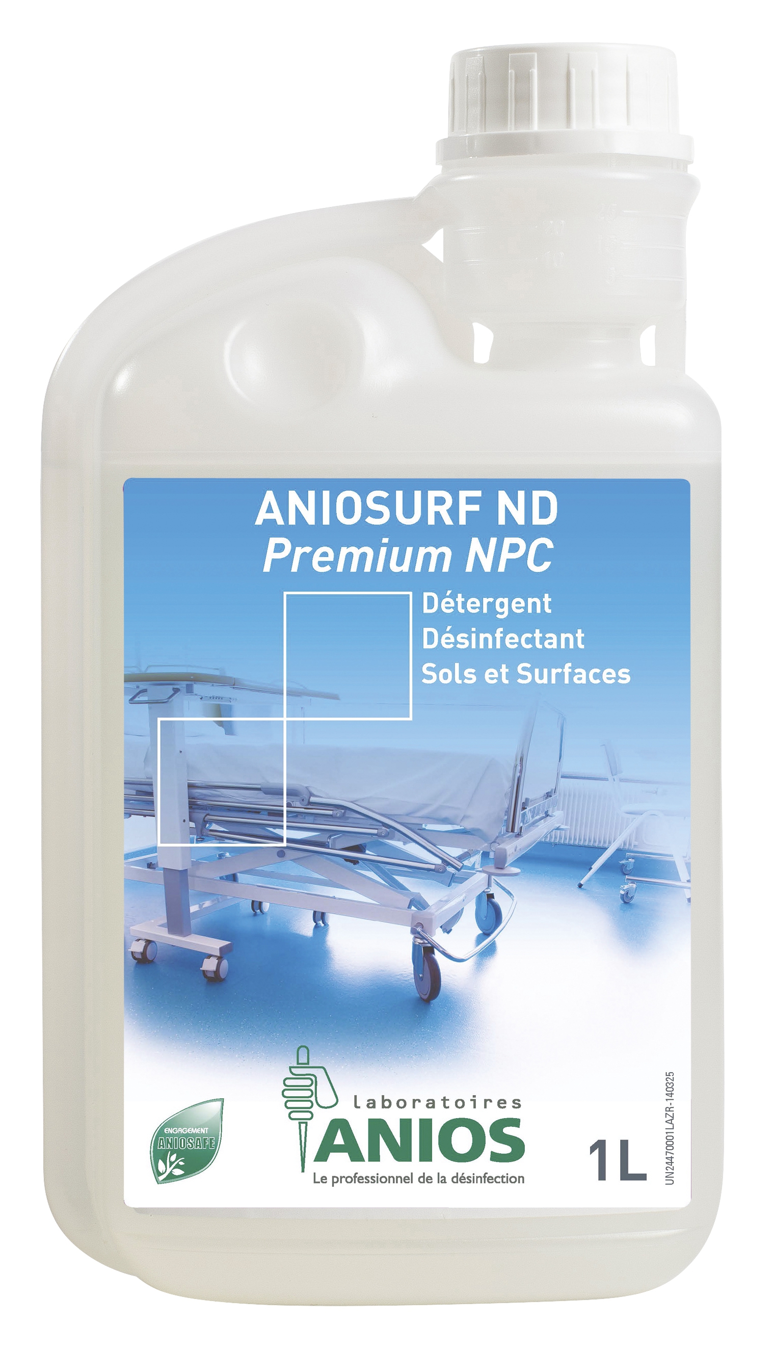 Indications* : Nettoyage et désinfection des sols, murs et matériel (y compris le matériel médical). Composition : Chlorure de didécyldiméthylammonium (N°CAS 7173-51-5 : 82 mg/g), Digluconate de chlorhexidine. (N°CAS 18472-51-0 : 5.2 mg/g), excipients. Propriétés microbiologiques* : Bactéries : EN 1040, EN 13727, EN 13727 sur BMR et BHR : 15mn. EN 13697 : 45mn. Levures : EN 1275, EN 13624, EN 13697 : 15 min. Mode d’emploi : Remplir un seau de lavage avec 8 litres d’eau. Dilution à 0,25% : Verser une dose de 20 ml d’AniosURF PREMIUM ND dans le seau de lavage. Après avoir effectué un balayage humide de la pièce, procéder au lavage en respectant le schéma de nettoyage : du fond vers la sortie. Ne pas rincer les surfaces. Changer de franges autant de fois que nécessaire. Mettre la frange sale dans le récipient prévu à cet effet. Après le nettoyage de chaque secteur, changer la frange, renouveler la solution de lavage. Précautions d’emploi* : Dangereux - respectez les précautions d’emploi. Utilisez les biocides avec précaution. Avant toute utilisation, lisez l’étiquette et les informations concernant le produit.