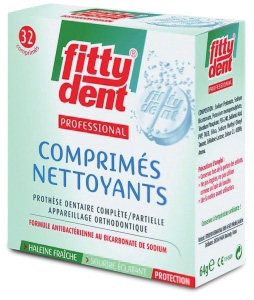 Indications : Nettoyage parfait des prothèses dentaires tout en respectant l’hygiène bucco-dentaire. Propriétés : Formule ultra-nettoyante et non agressive au pH 9. La puissante action nettoyante élimine rapidement tous les germes à l’origine de la mauvaise haleine et de la plaque dentaire. Son arôme mentholé rafraîchit les prothèses dentaires et les appareils orthodontiques. La formule à base de bicarbonate de sodium nettoie, favorise l’élimination du tartre et prévient la formation de la plaque dentaire et du jaunissement. Ces comprimés assurent aussi l’élimination des taches de goudron et de nicotine et la dissolution des taches tenaces, en particulier dans les endroits difficiles d’accès. Les ingrédients contenus dans ces comprimés contribuent à garder les gencives saines. Seul son pH 9 permet d’éliminer les résidus non solubles de la Crème Fixative Fittydent® Professional et d’éviter ainsi l’irritation de vos gencives tout en respectant les éléments métalliques présents dans les prothèses dentaires et les appareils orthodontiques. A utiliser quotidiennement.