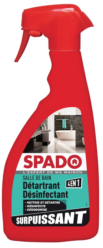 Propriétés : Nettoie : élimine les traces de savon et autres salissures •Détartre : élimine tous les dépôts calcaires •Désinfecte les surfaces, désinfectant conforme aux normes, à 20°C en conditions de saleté : Bactéricide EN 1276 et NF EN 13697, Temps de contact de 5 minutes. Lévuricide EN 1650 sur Candida Albicans, Temps de contact de 15 minutes. Virucide EN 14476 sur le virus influenza H1N1, Temps de contact : 15 minutes • Désodorise : laisse un agréable parfum fleuri.